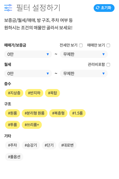 로그인까지 마무리하고 매물을 확인하는데 필터를 설정했습니다. 개인적으로 불편했던 점은 아래의 층수, 구조에 있는 토글 버튼과 인터랙션을 할때 호버 이벤트와 토글이 켜진 상태의 스타일이 동일해서 클릭해서 켰을때 스타일의 변화가 없기 때문에 조금 혼란스러운 경우가 있었습니다. 또 매물 리스트에서 필터 설정으로 들어가는 필터 버튼과 필터 설정 페이지에 초기화 버튼이 동일한 위치에 있어서 미스클릭으로 설정한 필터가 날아가는 경우가 가끔 있었습니다.