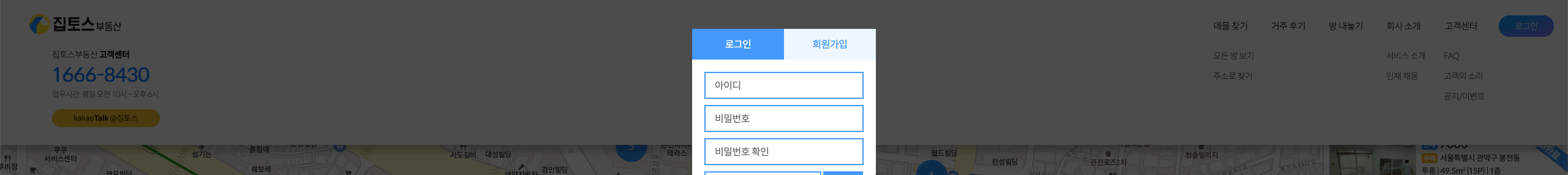 최근에 급하게 이사를 하게 되는 바람에 집을 구하던 중에 집토스를 사용하게 되었는데요. 원래는 피터팬에서만 찾아보다가 매물이 적다는게 느껴져서 집토스도 한번 사용해봤습니다. 일단! 회원가입이 간단한 편이었습니다. 그래서 아무생각없이 서비스에 접근하는데 크게 무리는 없었습니다. 개인적으로 소셜 로그인에 구글도 있었으면 좋았겠지만 페이스북만으로도 충분할듯 합니다.