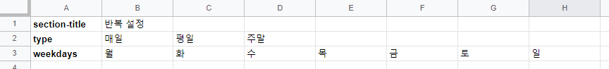 일단 섹션의 타이틀과 문자들을 더미데이터로 관리해줍니다. 구글 시트로 더미 데이터를 작성하는 자세한 정보는 플러그인 소개 혹은 문서 페이지를 참고해주세요.
