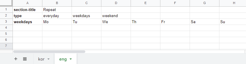 일단 섹션의 타이틀과 문자들을 더미데이터로 관리해줍니다. 구글 시트로 더미 데이터를 작성하는 자세한 정보는 플러그인 소개 혹은 문서 페이지를 참고해주세요.