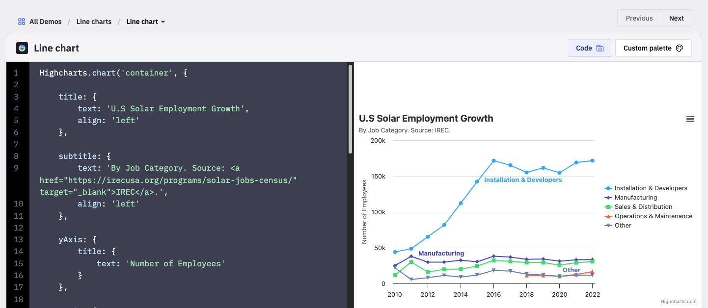 Highcharts 홈페이지에서 Demos로 들어가면 다양한 차트 타입의 인터랙티브한 데모를 경험할 수 있는데, 가장 중요한 건 Code를 활성화하면 아래와 같이 사용자가 직접 스타일 및 데이터 수정이 가능하다. 물론 수정하기 전에는 Highcharts 라이브러리 관련한 정보를 배워야겠지만 간단히 Claude에게 코드를 붙여 넣고 내가 원하는 스타일의 차트 및 데이터를 입력하고 코드 생성을 요청하였다