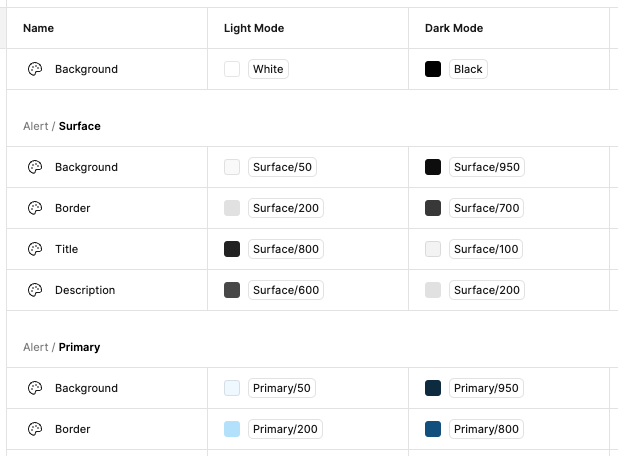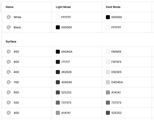 개인적으로는 TailwindCSS 스타일을 선호하는데 주로 Surface, Primary 컬러를 변수로 지정하고 사용한다. 가장 간편하긴 한데 위의 이미지를 보면 라이트 모드, 다크 모드의 컬러값이 서로 반전되어 있다. White의 라이트 모드값은 #FFFFFF, 다크 모드값은 #000000인데 이건 Surface, Primary 값들도 마찬가지이다.
