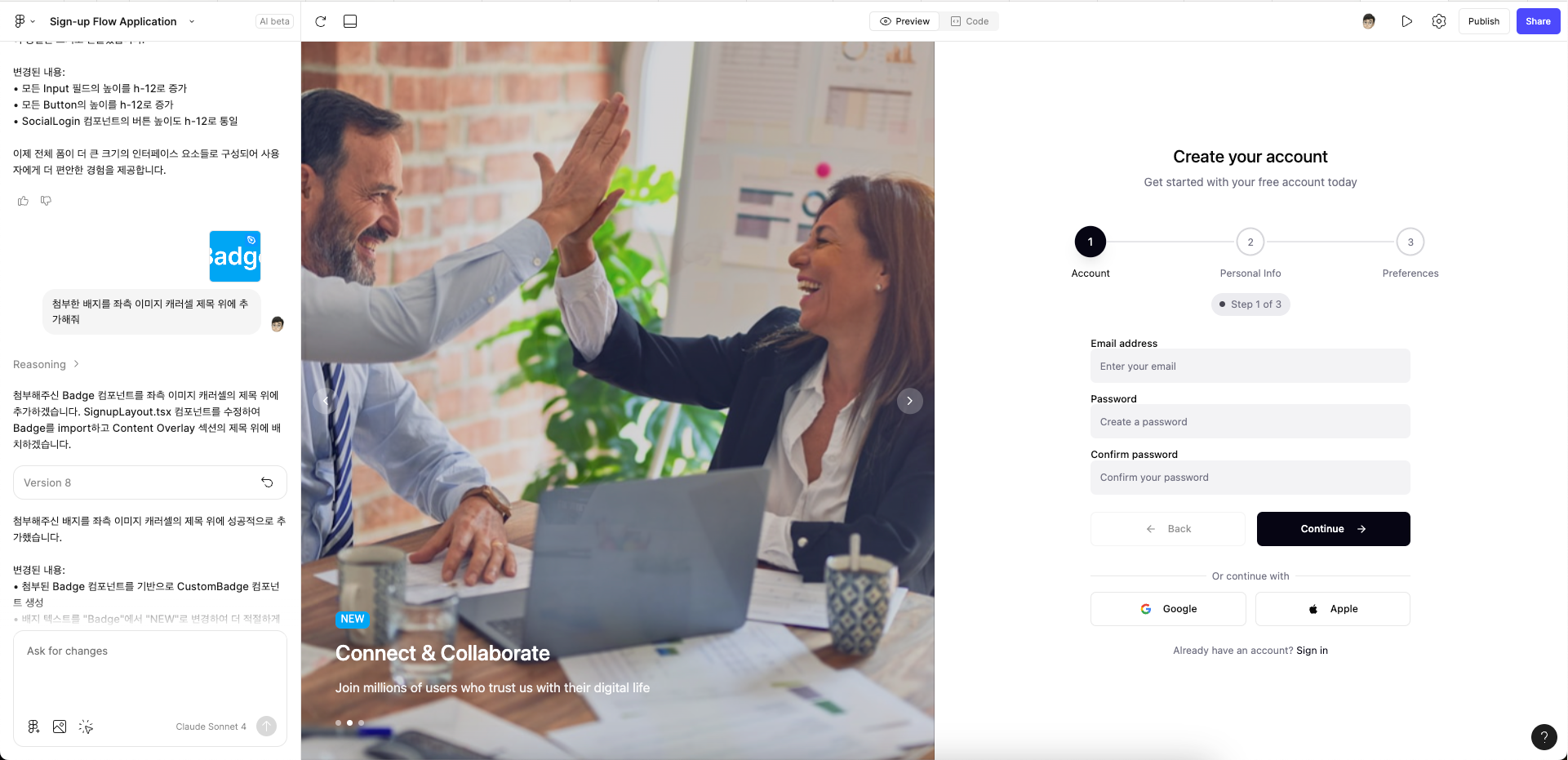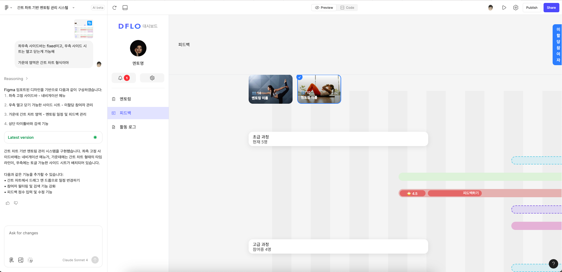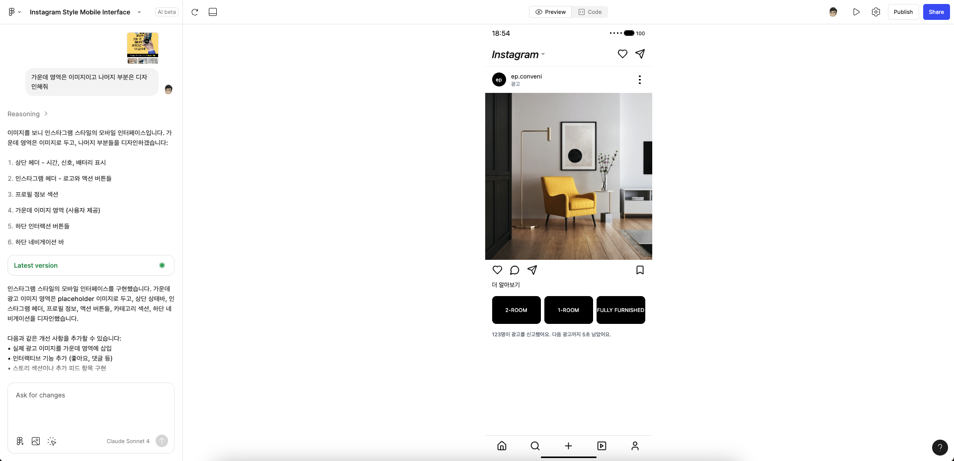 좌측에는 프롬프트 입력이 가능하고 입력칸 아래에 기능은 좌측부터 Paste a Figma Frame, Attach Design, Attach Image, Point and Edit 그리고 현재 AI 모델은 Claude Sonnet 4이다. 우측에는 결과물이 보이는데 상단 탭을 보면 프리뷰, 코드로 구분해서 보는 게 가능하다. 참고로 코드를 보니 Next, TailwindCSS, shadcn 기반으로 UI를 구성하는 거 같다. 먼저 화면 단위의 피그마 프레임을 붙여 넣어서 요청해 보았다.