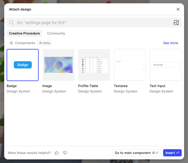 이번엔 Attach Design 메뉴를 테스트했는데 예상했던 화면이랑 좀 다르다. 여기서는 같은 팀에서 퍼블리싱된 컴포넌트만 보이는데 Variants가 포함된 버튼 컴포넌트로 요청을 해보았다.