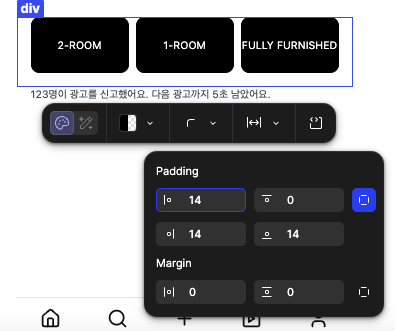 웹브라우저의 개발자 도구랑 비슷한 Point and Edit로 요소를 클릭하면 사용자가 직접 수정이 가능한 요소가 툴바로 나오게 된다. 현재는 배경색, Border Radius, Padding, Margin 정도인 거 같은데 코드 베이스로 돌아가다 보니 지원되는 거 같다.