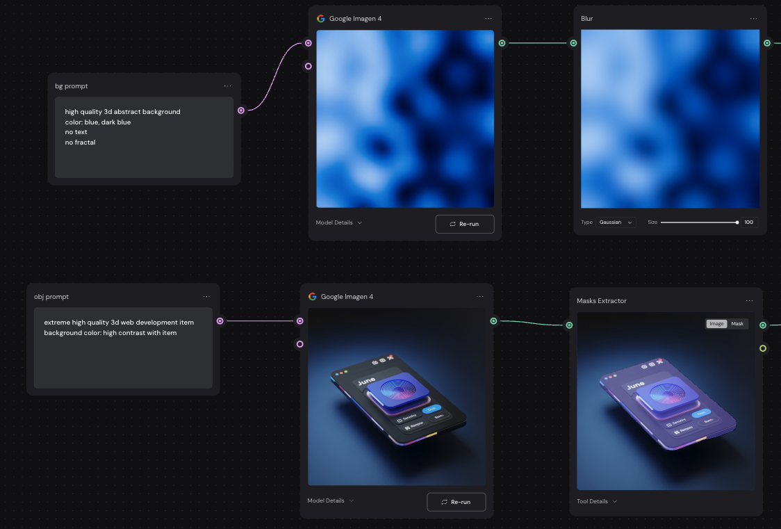 대략적으로 생각한 워크플로우는 블러가 적용된 배경을 만든 다음 3D 오브젝트를 생성하고 마스크 추출을 통해 오브젝트만 추출한다. 마스크 추출 말고 배경을 제거하는 AI 모델도 있는데 이건 크레딧과 시간이 소모되고 경우에 따라 퀄리티가 감소하기 때문에 마스크 추출에서 클릭 한 번에 오브젝트가 추출돼서 이 방법으로 하였다. 배경 결과물이 맘에 들지 않는데 이건 프롬프트 수정으로 개선이 가능할 거 같고, 추후에는 시스템 프롬프트를 적용해서 프로덕트 혹은 브랜드의 일관성 및 이미지 전달에도 적용이 가능하다고 생각했다.