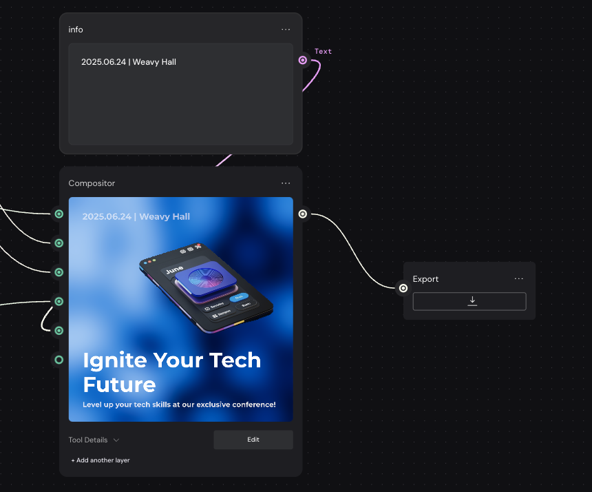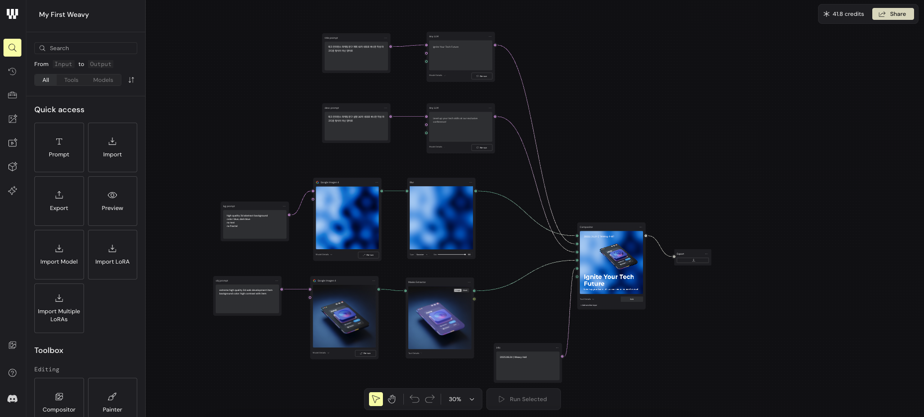 소개 페이지에서 현재 없는 기능도 소개하는 등 약을 살짝 쳤지만 그래도 허무맹랑하고 현실성 없는 기능은 아니기에 추후 추가될 거라 생각한다. Weavy의 특징 및 장점은 굉장히 다양한 생성형 AI 모델이 한 군데에 있고 서로 필요한 영역에서 적절하게 사용 및 비교가 가능하며 Compositor를 통해 텍스트 레이어를 포함해서 기본적인 편집 및 합성이 가능하다. 다만 아직 사용성은 떨어지는데 이게 메인 기능은 아니기에 추후 개선이 되면 좋을 거 같다.