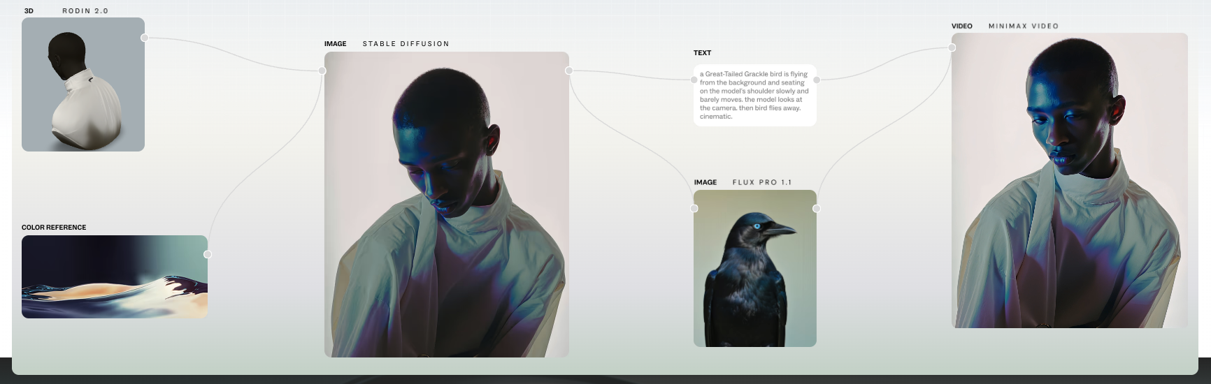 Weavy 소개 페이지의 내용인데 일단 UI가 노드 형태이다. 노드는 워크플로우를 한 눈에 파악 및 수정하는데 용이하고, 반복되는 작업에서 사용성이 좋다. 도메인에 따라 인풋, 아웃풋의 타입에 대한 사전 지식이 많이 필요한 단점도 있다. 대표적인 예로 n8n, zapier 등이 있는데 예전에는 3D 프로그램에서 매터리얼 관리를 하면서 사용했었는데 이제 이미지, 비디오 생성형에도 노드 형태의 UI가 적용되어 가면서 기분이 묘하다. 아마 노드 형태의 인터페이스를 배우거나 디자인해야 하는 상황도 있을 거 같다.