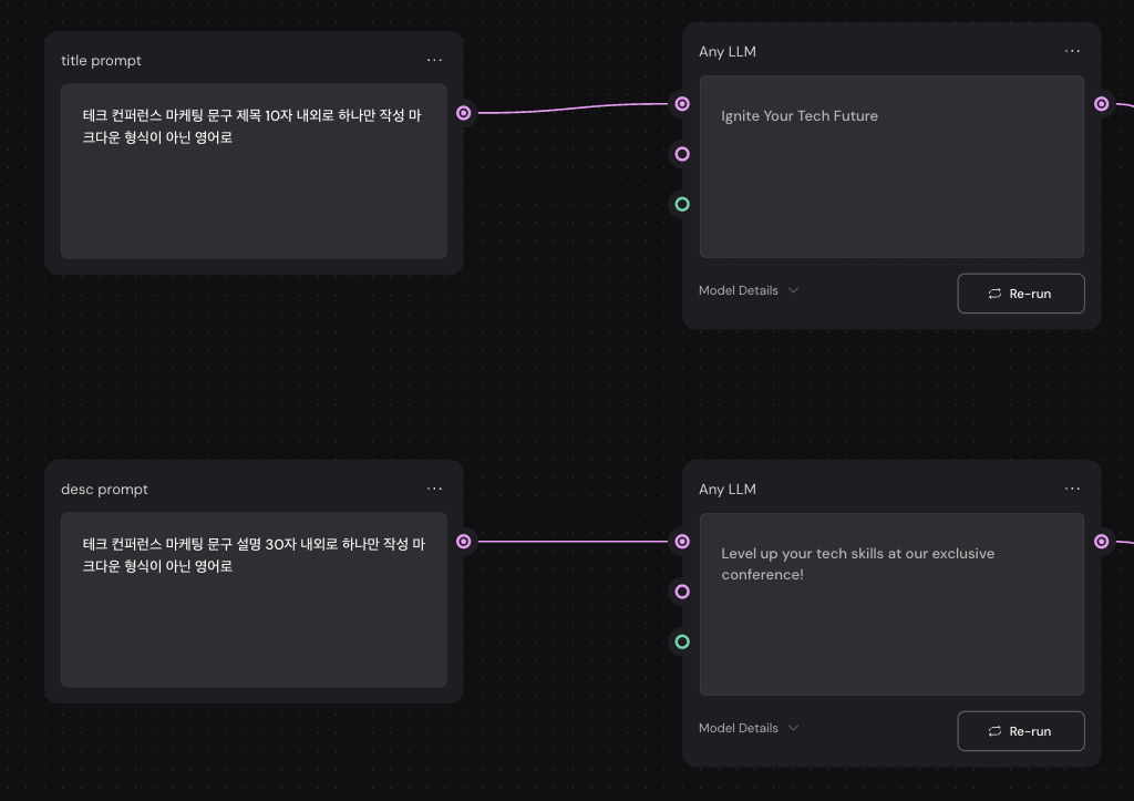 일단 이것저것 만져보다가 테크 컨퍼런스 홍보를 컨셉으로 SNS에 올리는 마케팅 용도의 이미지 애셋을 만들어보기로 하였다. 제목 및 설명 문구부터 생성했는데, 한글로도 프롬프트 작성이 가능했다.
