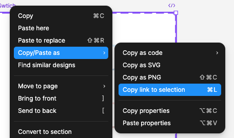 사용법은 간단한데 아래 이미지와 같이 컴포넌트 우클릭하고 Copy link to selection를 누르면 컴포넌트 경로를 가진 링크를 복사하게 된다. 이걸 프롬프트 입력칸에 붙여 넣고 입맛에 맞게 요청을 하면 된다.